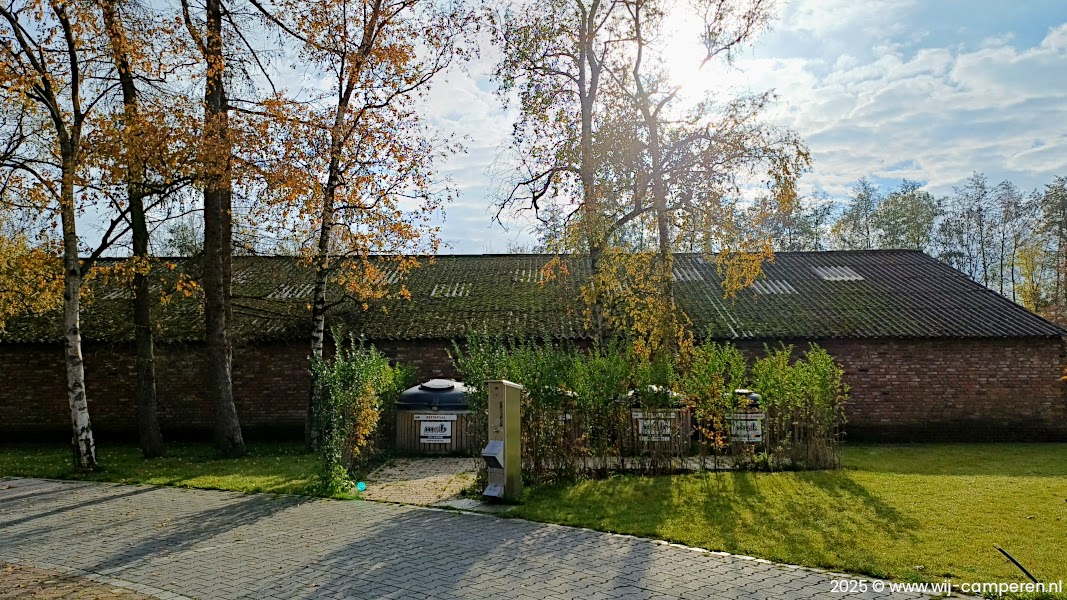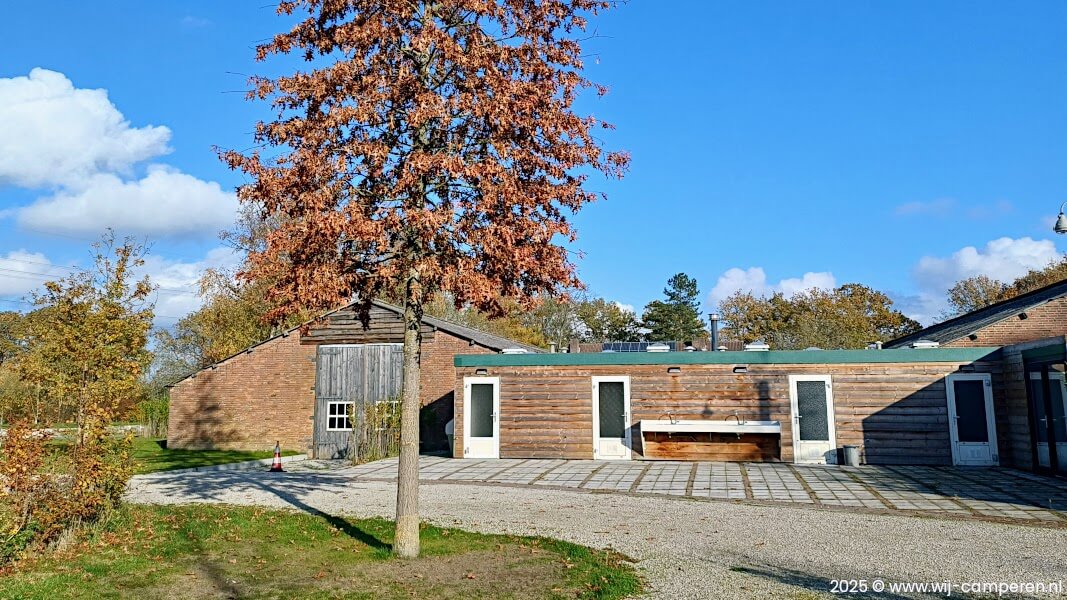 Het sanitair gebouw ligt aan de linkerzijde van het camperpark. Sta je aan de rechterkant, dan is het best een eind lopen naar het sanitair.