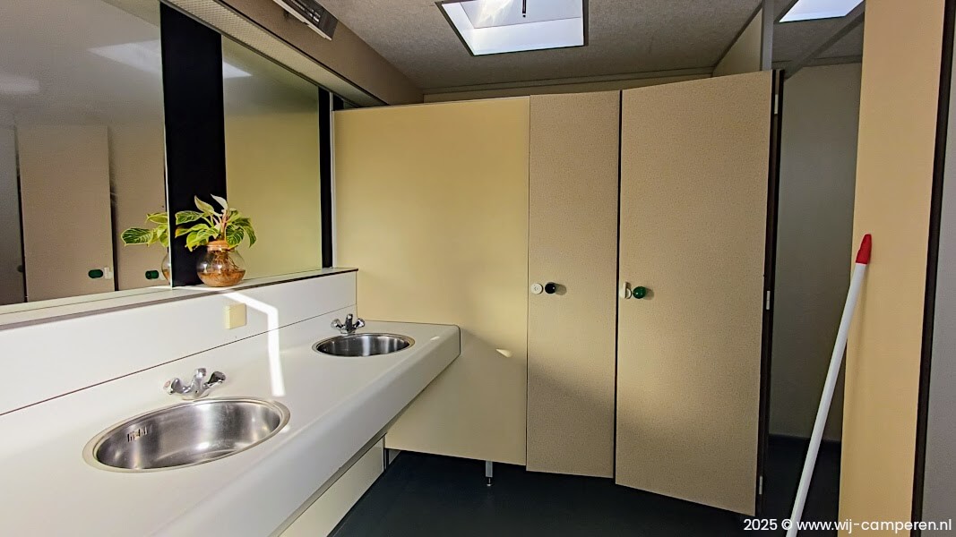 Het verwarmde sanitair bestaat uit één grote unit met twee sanitairblokken. In elk blok vind je vier toiletten, twee douches, twee wastafels en een wascabine. Er zijn geen urinoirs. Je mag onbeperkt douchen, zonder munten. Er is aan alles gedacht: zeep, trekkers, toiletpapier, papieren handdoeken en een prullenbak. Tijdens ons verblijf was één sanitairblok gesloten vanwege de lagere bezetting.