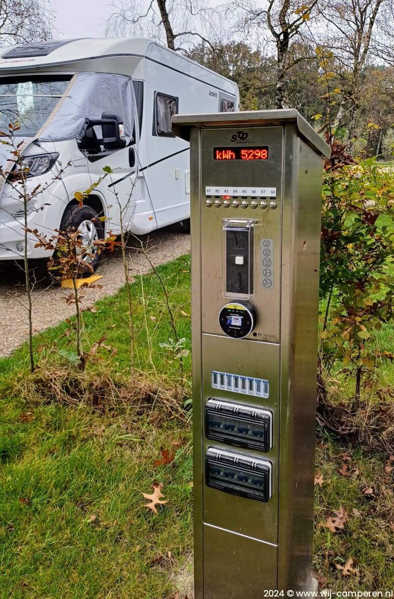 Je kunt kiezen uit een plek met of zonder 16A stroom. Er zijn 52 plekken met stroom. Betalen voor stroom doe je aan de stroompaal. De prijs is € 0,60 per kWh. Wij kiezen voor een standaard plek met 16A stroom, dicht bij het sanitair gebouw.