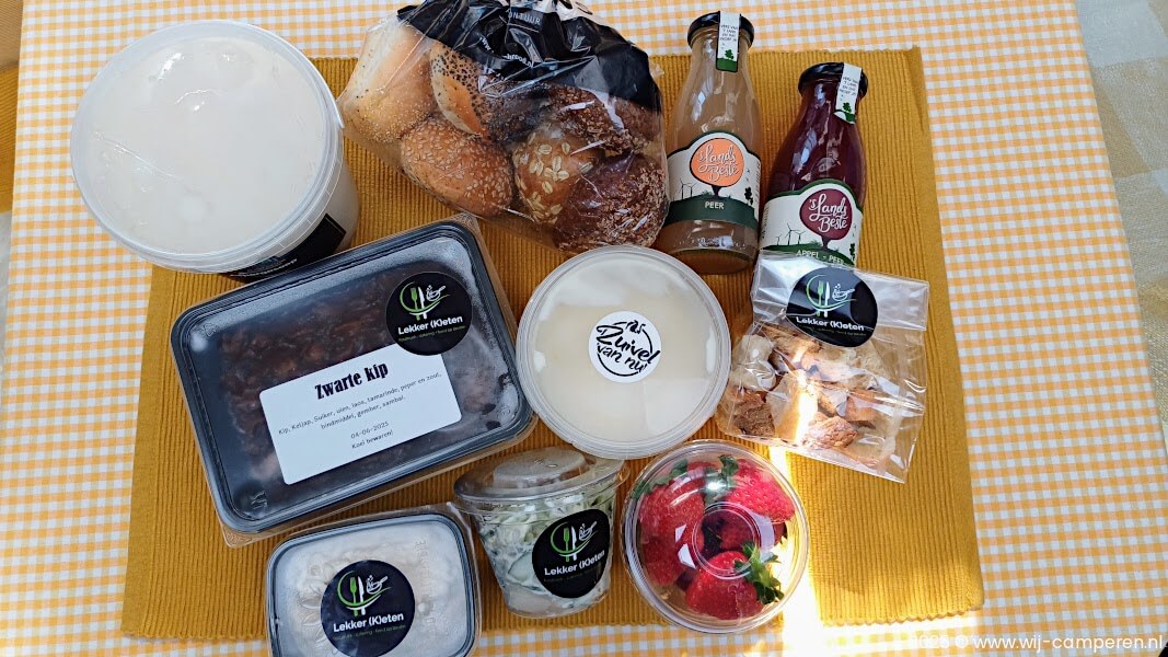 's Ochtends bezorgt Steffie de brunchboxen bij de campers. De box ziet er verzorgd uit en de inhoud ook. Jammie, lekker smullen vanavond van lokale seizoensproducten. Voor ons het is een dinerbox. De inhoud is meer dan genoeg voor ons twee.