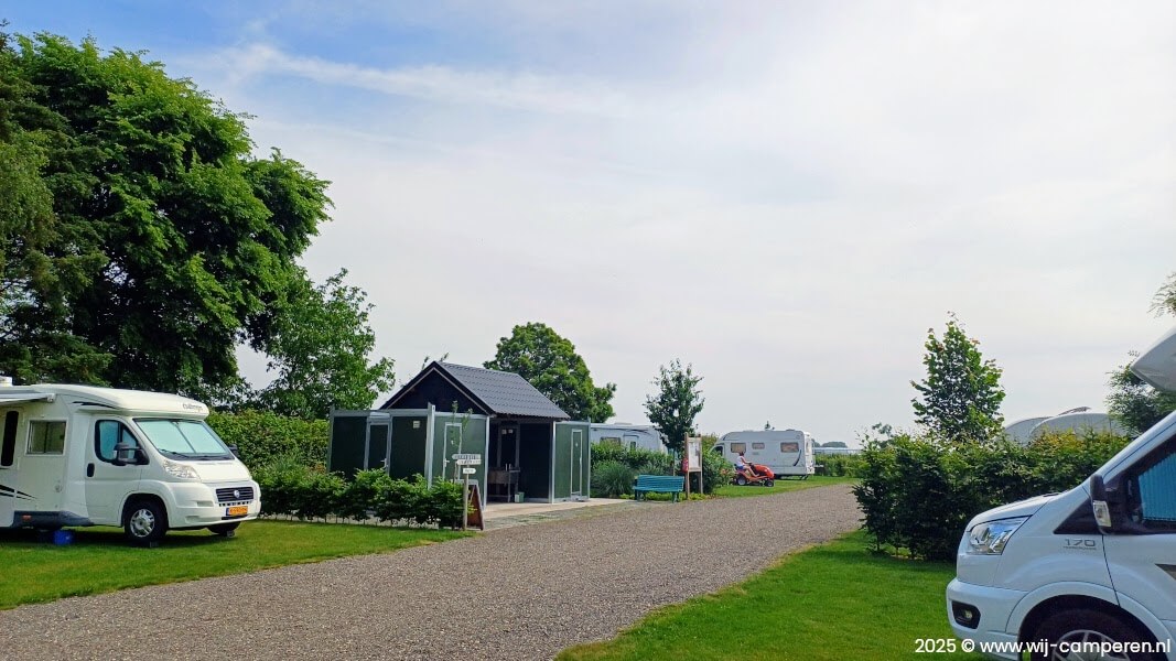 De eerste indruk is helemaal goed. De camperplaats oogt ruim en groen. We kiezen een plek dichtbij het sanitair gebouw.