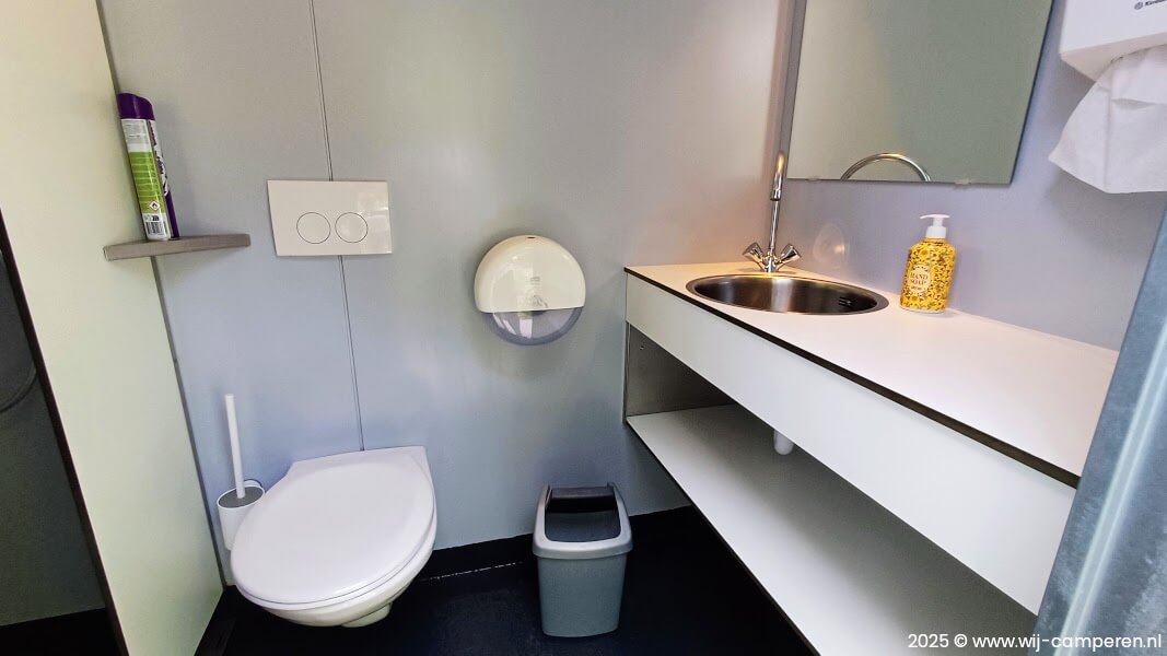 Het sanitair bestaat uit 4 dezelfde units met in elke unit een toilet, douche en wastafel. Er zijn 4 toiletten, 4 douches en 4 wastafels. Als er iemand onder de douche staat is het toilet bezet.