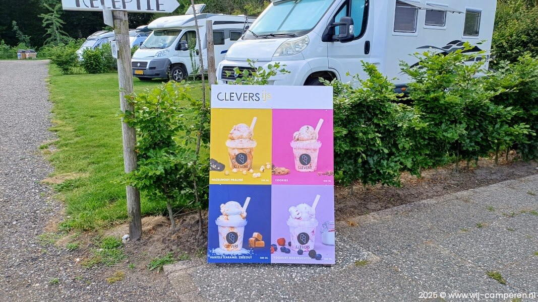 Op de camperplaats verkopen ze o.a. wijn en nog wat kleinere producten. En ijs van Clevers IJssalon. Komt dat even goed uit, wij zijn fan van Clevers ijs, altijd lekker.
