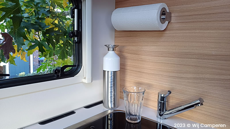Een grote waterfles ontbreekt niet in de camper. We hebben een grote watertank maar die gebruiken we nooit voor drinkwater. We tappen altijd vers drinkwater, gewoon bij de kraan.